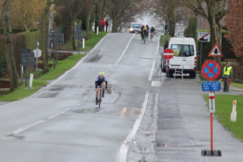 The pro race Dwaes door West-Vlaanderen went passed and once the convoy had cleared, we were off, 11 laps to go, no one was committing into the headwind and I made sure I was in the front when we hit the left hander, the bunch was strung out down the descent with a couple of us pressing on and carrying it on. We shortly hit the S bend and seeing the bunch had split up a bit and was carrying a bit of speed, I hit an attack around the front few riders. No one was prepared to chase and I opened up a pretty decent gap when I hit the main road. I pressed on up the climb. I was fired up and felt good, I kept a good tempo with the aim being to stay out front for another one or two laps picking up the 20 Euro prime. 3 laps had gone by and I still had a decent gap. A bunch of six, I could see, started working well to pull me back, but I just stayed locked in my tempo expecting to be caught with 5 to go. By now I had picked up 100 Euros, so was pretty happy. But I just had in my head, go on hold off the break, go for one more. The group was getting closer and closer, I thought the catch was going to be made but I kept drilling. They were so close within 150 metres of me.